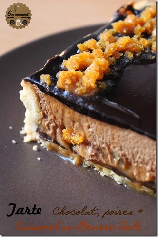 Je vous présente une recette dont je suis très fière, une déliciiiieuse tarte composée d’une pâte sucrée, d’une ganache chocolat noir, des poires au miel, du caramel au beurre salé, une mousse au chocolat au lait, un glaçage miroir au chocolat et des brisures de caramel beurre salé !