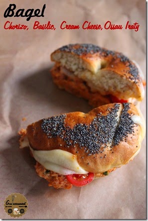 Vous allez commencer à percevoir mon obsession pour les Bagels (après celle pour les Cheesecakes !), je vous ai proposé il y a peu la recette du petit pain troué Montréalais (allez, j’ose le dire !), voici une première idée de garniture : une tartinade Chorizo/Cream Cheese / Basilic, de l’Ossau Iraty, des Tomates Cerises et de la Roquette.